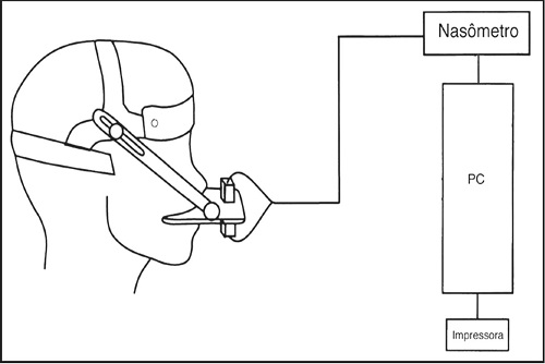 A nasalância (correlato acústico da nasalidade) foi determinada utilizando-se um nasômetro modelo 6200-3 IBM (software versão 30-02-3.22), composto por dois microfones separados por uma placa metálica, que captam os sinais dos componentes nasal e oral da fala. O exame é realizado durante a leitura de um conjunto de cinco frases contendo sons exclusivamente orais do Português Brasileiro. Na medida em que o texto, apresentado na tela do microcomputador conectado ao sistema, é lido, os sinais são captados pelos microfones e a nasalância é calculada pela razão numérica entre a energia acústica nasal e a energia acústica total (soma da energia acústica nasal e oral), multiplicada por 100. O valor de 27% é considerado como o limite superior de normalidade. Assim, valores superiores a 27% são considerados como indicativos de hipernasalidade. A Figura 1 mostra, de forma esquemática, a configuração do sistema.