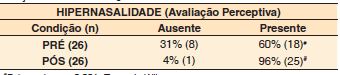 De acordo com a avaliação perceptiva da fala, na situação PRÉ, 31% (8/26) dos pacientes apresentavam ressonância equilibrada, enquanto que 69% (18/26) apresentavam hipernasalidade. Na situação PÓS, 4% (1/26) permaneceram com ressonância equilibrada e 96% (25/26) apresentaram hipernasalidade. A análise individual dos dados mostrou que 7 indivíduos passaram a apresentar hipernasalidade após a secção do RF. A comparação estatística mostrou que houve diferença entre as porcentagens de indivíduos nas condições PRE e PÓS (p < 0,001). A proporção de pacientes que apresentava ressonância equilibrada e hipernasalidade antes e após a secção do RF está demonstrada na Tabela 1.