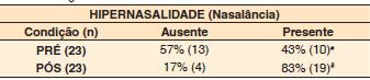Os dados da nasometria foram analisados a partir de um total de 23 pacientes, tendo em vista que 3 indivíduos não realizaram esta avaliação pós-cirúrgica. De acordo com a avaliação nasométrica, na situação PRÉ, 57% (13/23) dos pacientes apresentavam valores de nasalância indicativos de normalidade (ausência de hipernasalidade), com média de nasalância de 15±8% e 43% (10/23), valores indicativos de hipernasalidade (média de nasalância de 41±7%). Na situação PÓS, 17% (4/23) dos pacientes permaneceram com valores indicativos de normalidade (média = 19±10%) e 83% (19/23) apresentaram hipernasalidade (média = 45±7%). Isto significa que, de acordo com a nasometria, 9 indivíduos sofreram deterioração da ressonância de fala, com o aparecimento da hipernasalidade após a secção do RF. A análise estatística mostrou que, após a secção do retalho faríngeo, os pacientes apresentaram valores médios de nasalância significativamente maiores, quando comparados àqueles obtidos antes da cirurgia (p < 0,001), conforme demonstrado na Tabela 2.