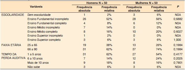 Na Tabela 1 , consta a caracterização dos 100 participantes quanto a escolaridade, faixa etária e tempo de percepção da perda auditiva, separados por gênero (50 do gênero feminino e 50 do gênero masculino).
