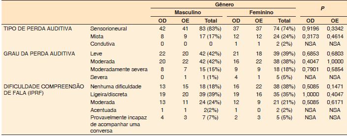Na Tabela 2 , encontram-se descritas as características das perdas auditivas, quanto a tipo e grau da perda, e resultados do IPRF, por gênero.