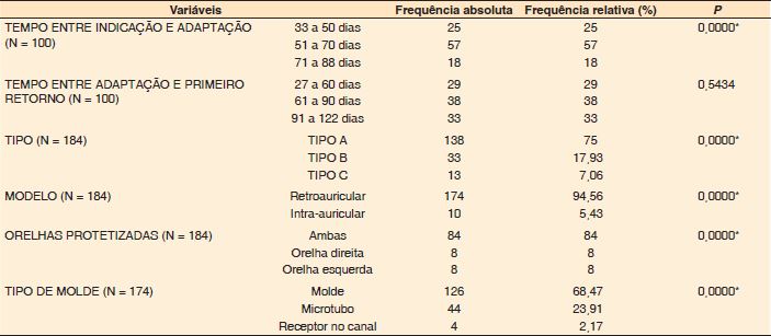 Foi adaptado um total de 184 próteses auditivas, sendo 84 adaptações bilaterais e 16 unilaterais (oito na orelha direita e oito na orelha esquerda), sendo 94,56% do modelo retroauricular e 5,43%, intra-auricular, de tecnologia de tipo A (75%), B (17,93%) e C (7,06%). Houve diferenças significativas quanto à tecnologia das próteses auditivas indicadas, predominando o tipo A, e ao modelo das próteses, predominando as retroauriculares, com molde canal, meia-alça e concha escavada, adaptadas em ambas as orelhas.