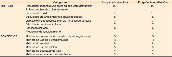As queixas e os benefícios coletados pela entrevista foram referidos pelos participantes e estão apontados a seguir. A queixa mais relatada foi em relação à regulagem (22%) da prótese auditiva, referindo-se a problemas no ajuste do ganho. Outras queixas envolveram ruídos ambientais (14%), desconforto com o molde (13%), dificuldade em ambientes não ideais de escuta (8%), queixas de coceira, otorreia, inflamação, tontura (7%), dificuldade na manipulação e colocação da prótese (7%), sensação de oclusão (6%) e problemas de funcionamento (1%).