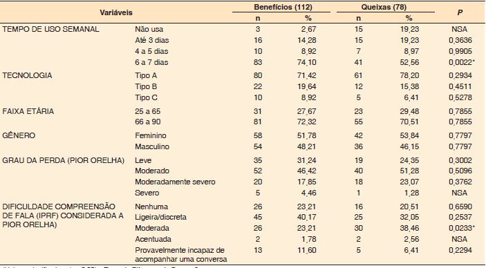 Houve diferenças significativas com relação ao tempo de uso, sendo que os usuários que utilizavam de seis a sete dias por semana relataram mais benefícios do que queixas (p=0,0022). Houve diferenças significativas em relação à compreensão de fala (resultado do IPRF), verificando-se que usuários com perda auditiva de grau moderado citaram mais queixas do que benefícios. Não foi observada diferença entre os tipos A, B ou C, faixa etária, gênero e grau da perda auditiva.