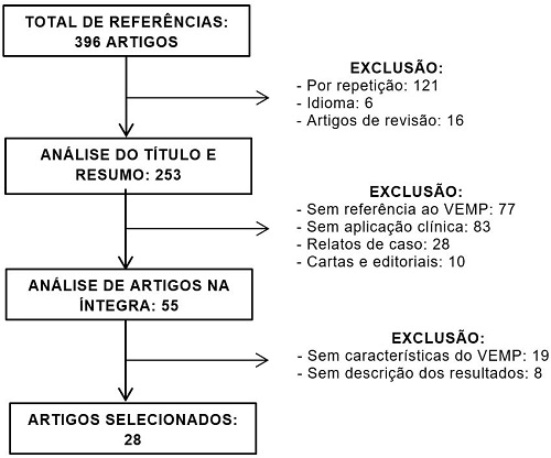 Os artigos que não abordaram o VEMP e a aplicação clínica no título ou resumo, não citaram as características do VEMP utilizado e não descreveram os resultados da avaliação foram excluídos. Também foram excluídos os artigos repetidos nas bases de dados, artigos de revisão de literatura, relatos de caso, cartas e editoriais.