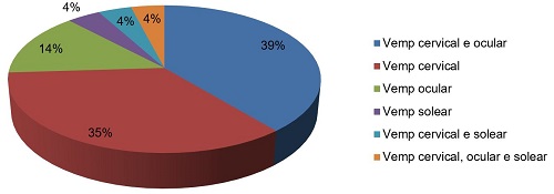 Os estudos sobre o VEMP com estímulo auditivo evidenciaram o exame como ferramenta auxiliar para o diagnóstico de diversos tipos de alterações vestibulares periféricas, predominando a doença de Ménière(5,6,29,40) e a deiscência do canal semicircular superior (SSCD)(8-11,32) e de doenças que cursam com alterações vestibulares centrais, como, por exemplo, as mielopatias motoras(19-25) e a doença de Parkinson(15,41-43).
