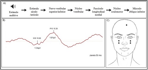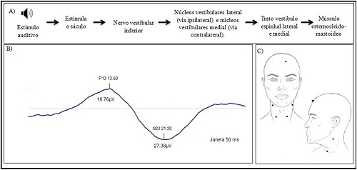 O VEMP surge a partir das respostas musculares reflexas decorrentes dos reflexos vestíbulo-ocular, vestíbulo-masseter e vestíbulo-espinal. Estes dependem da integridade funcional da mácula sacular e utricular, do nervo vestibular inferior, do nervo vestibular superior, dos núcleos vestibulares, das vias vestibulares centrais e das placas neuromusculares envolvidas(3,4). Uma alteração em qualquer uma das estruturas relacionadas resulta em alteração do VEMP.