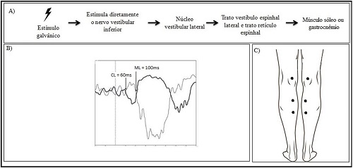 O VEMP pode ser gerado por estímulo auditivo ou galvânico e a resposta evocada pode ser captada na musculatura oculomotora, cervical, no músculo masseter, intercostal, braquial, sóleo ou gastrocnêmio. O princípio básico é a ação do músculo de captação da resposta no controle postural, seja através do reflexo vestíbulo-ocular, vestíbulocólico ou vestíbulo-espinal(2,3). Com esse enfoque, a aplicabilidade do VEMP varia conforme o tipo de estímulo e o músculo de captação da resposta eletromiográfica(2,5).