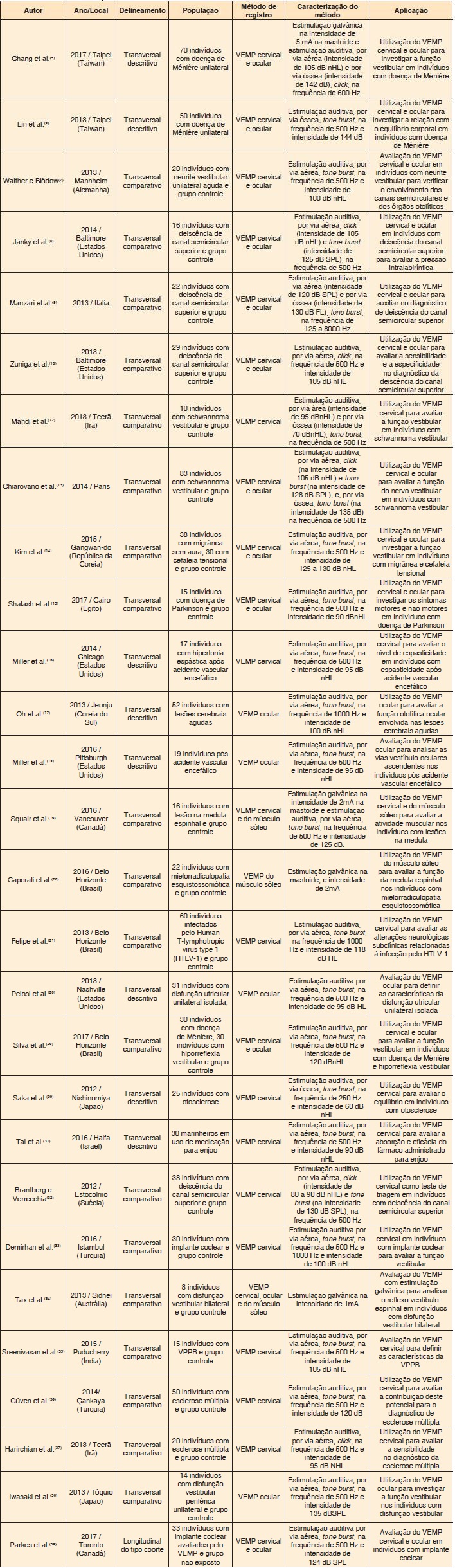Em relação à população/amostra de pacientes com alterações vestibulares incluída nos estudos, as aplicações clínicas mais investigadas referiram-se à doença de Ménière(5,6,29), síndrome de deiscência do canal semicircular superior(8-10,32), schwanoma vestibular(12,13) e doenças centrais(15-21,36,37).