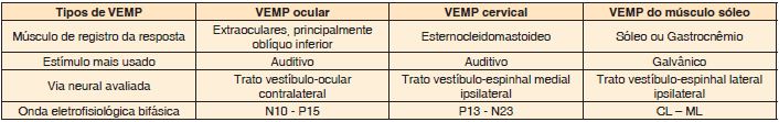 Neste artigo, revisamos os aspectos clínicos do VEMP, as modalidades de estímulo e os músculos mais usados para o registro da resposta evocada. O VEMP cervical, o VEMP ocular e o VEMP do músculo sóleo são os mais utilizados. O estímulo auditivo é o mais usado para gerar o VEMP cervical e ocular, enquanto o estímulo galvânico (elétrico) é o mais usado para gerar o VEMP do músculo sóleo. Estes testes são muito importantes para a avaliação da função do sistema vestibular periférico e central.