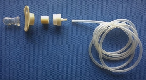 O equipamento S-FLEX® (Figura1), da empresa TODMED (Blumenau, SC), é um instrumento que registra a pressão de sucção não nutritiva em recém-nascidos, tanto na forma gráfica, como numérica. É composto por um bico de chupeta com orifício na extremidade, acoplado a um aro confeccionado no formato côncavo e anatômico e um sensor de pressão. Um extensor de diâmetro de 1,25 mm e comprimento de 1,5 m conecta a chupeta ao aparelho. O equipamento permite a adaptação de diferentes bicos de chupetas. O bico escolhido para o presente estudo foi de formato ortodôntico, confeccionado em silicone, extraído da chupeta modelo oral fit, tamanho 1, da marca comercial NUK®, indicado para lactentes de 0 a 6 meses de idade. Na extremidade do bico, foi aberto um orifício com a ponta diamantada 1014 (KGS). As características físicas do equipamento proporcionam a realização da coleta de dados em diferentes ambientes, o que facilita a investigação da interação do recém-nascido com o ambiente, sem perder a validade ecológica. Os materiais e os componentes que entram em contato direto com o recém-nascido, durante seu uso, satisfazem os requisitos de biocompatibilidade e segurança elétrica, são desmontáveis, de uso individual, e permitem higienização e esterilização por autoclavagem adequadas (Figura 2).