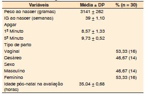 A média da idade gestacional e do peso ao nascer foi de 39 ± 1,10 semanas e 3141 ± 262 gramas, respectivamente. Quanto ao sexo, 53,33% eram meninas e 46,67%, meninos. Um pouco mais da metade (53,33%) nasceu de parto vaginal e o grupo, como um todo, teve boa vitalidade ao nascimento. A avaliação da pressão de sucção ocorreu, em média, com 35,04 ± 0,68 horas de vida. As características gerais dos recém-nascidos incluídos no estudo estão apresentadas na Tabela 1.