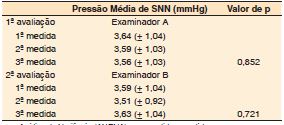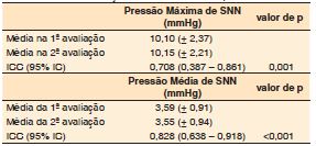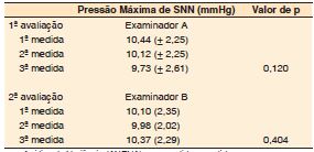 Para a análise da reprodutibilidade, as médias da pressão máxima e da pressão média obtidas com o S-FLEX®, por cada examinador, foram analisadas através do coeficiente de correlação intraclasse, que evidenciou boa e excelente correlação, respectivamente (Tabela 4).