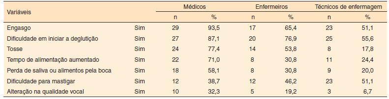 Com relação aos sinais e sintomas da disfagia, a equipe médica apresentou-se melhor esclarecida; o engasgo durante as refeições foi referido por 93,5% dos médicos. Enfermeiros não identificaram sinais importantes para detectar disfagia, como dificuldade para mastigar (53,8%), tempo aumentado de alimentação (69,2%), alteração na qualidade vocal (80,8%) e tosse (46,2%). Quanto aos técnicos de enfermagem, observou-se a necessidade de mais informações sobre os sintomas da disfagia, pois a maioria não soube identificar os sinais apresentados por pacientes disfágicos; tosse e alteração na qualidade vocal, durante a ingesta por via oral, não foram identificadas como sinal de disfagia por 82,2% dos enfermeiros e 93,3% dos técnicos de enfermagem (Tabela 2).