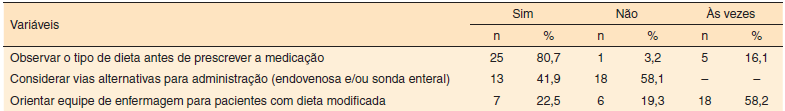 Sobre a prática médica para prescrição e administração de medicamentos, por via oral (comprimidos, cápsulas e emulsões), 80,7% dos médicos afirmaram observar o tipo de dieta liberada para o paciente disfágico, antes de prescrever o tratamento medicamentoso. No entanto, apenas 13 profissionais informaram considerar a utilização de outras vias de administração, como endovenosa ou sonda enteral, quando o paciente tem restrição de alguma consistência. Com relação à rotina de orientação à equipe de enfermagem, no momento da administração das medicações, apenas 7 médicos referiram este hábito (Tabela 3).