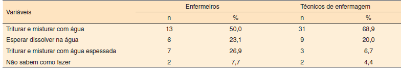 No que tange à administração dos medicamentos, o método mais utilizado foi triturar o comprimido (ou abrir a cápsula) e misturar com água – 50,0% dos enfermeiros e 68,9% dos técnicos de enfermagem citaram esta conduta. Ainda, 23,1% dos enfermeiros e 20,0% dos técnicos de enfermagem referiram que colocam o comprimido na água e esperam dissolver, para, então, medicar o paciente. Triturar a medicação e misturar em água espessada, para pacientes com restrição de consistências sólida e líquida, foi outra conduta relatada (Tabela 4).