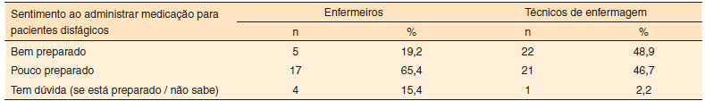 Em relação à segurança de cada profissional ao administrar medicações, por via oral, em pacientes com dificuldade de deglutição, 65,4% dos enfermeiros informaram que se sentem pouco preparados e 46,7% dos técnicos de enfermagem também referiram sentir-se inseguros (Tabela 5).