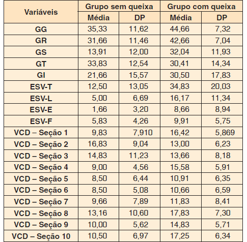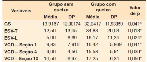 As medidas perceptivo-auditivas e de autoavaliação foram comparadas entre os grupos com e sem queixa vocal. Observou-se que pacientes portadores de EM com queixa vocal apresentaram maiores escores no ESV-T (p= 0,026), ESV-L (p= 0,042), VCD - seção um (p= 0,041), VCD - seção quatro (p= 0,030) e VCD - seção dez (p= 0,050) ( Tabela 1 ).