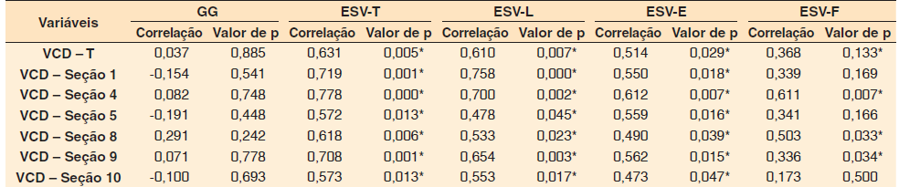 Na sequência, investigou-se a correlação entre o GG e os escores da ESV e do VCD. Houve correlação positiva forte entre os escores do ESV-T e ESV-L e os escores da seção um e quatro do VCD, bem como entre o escore ESV-T e a seção nove do VCD ( Tabela 2 ).