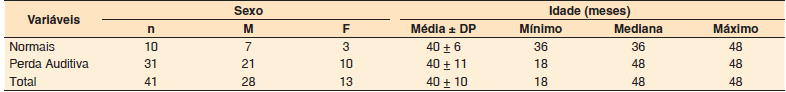 Do total de 41 crianças que foram selecionadas a participar da pesquisa, foram avaliadas 10 crianças com audição normal e 31 crianças com perda auditiva, sendo 13 do sexo feminino (32%) e 28 do sexo masculino (68%). Das 41 crianças avaliadas, todas permitiram a realização da VRA com fones supra-aurais do tipo TDH-39, possibilitando a avaliação das duas orelhas separadamente, totalizando 82 orelhas, sendo 20 orelhas normais e 62 com perdas auditivas de diversos graus. A idade das crianças variou de 18 a 48 meses, sendo a média de idade de 39,7 meses ( Tabela 1 ).