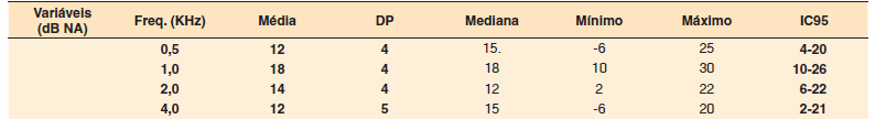 Tão importante quanto a diferença, é a sua variabilidade, ou desvio padrão, isto é, o quanto os valores obtidos pelas diferenças entre os limiares variam em torno da média. Os desvios padrão das médias das diferenças variaram de 4 dB a 5 dB ( Tabela 2 ), concordando com o estudo de Calil et al.(20), no qual foi observada variação de 5.4 dB a 12.6 dB.