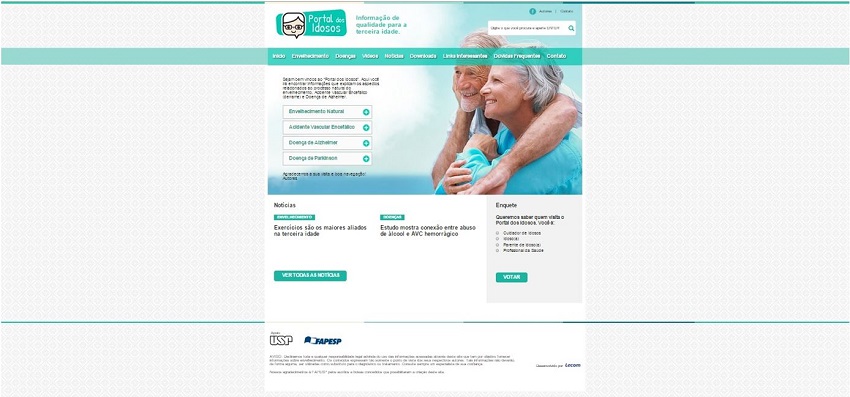 Encontram-se disponíveis no Portal dos Idosos 9 itens que compõem seu menu principal, sendo um deles a “Doença de Alzheimer”, com 8 submenus e seu referencial bibliográfico. Outros itens do menu também possuem aspectos relacionados à DA, como “Notícias”, “Vídeos”, “Links Interessantes” e “Downloads”. Além disso, a fim de estabelecer um elo com a comunidade que visita o website, foi criado um e-mail inserido no menu “Contatos” e também é possível localizar o vínculo institucional e órgão de fomento ( Figura 2 ).