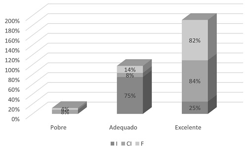A classificação da qualidade do website, de acordo com as categorias, foi avaliada como “excelente” por 88% dos idosos, 75% dos cuidadores de idosos e 71% dos fonoaudiólogos ( Figura 4 ). A análise estatística referente às subescalas do questionário Emory (Health-Related Web Site Evaluation Form Emory) e as categorias não apresentou diferença estatisticamente significativa.