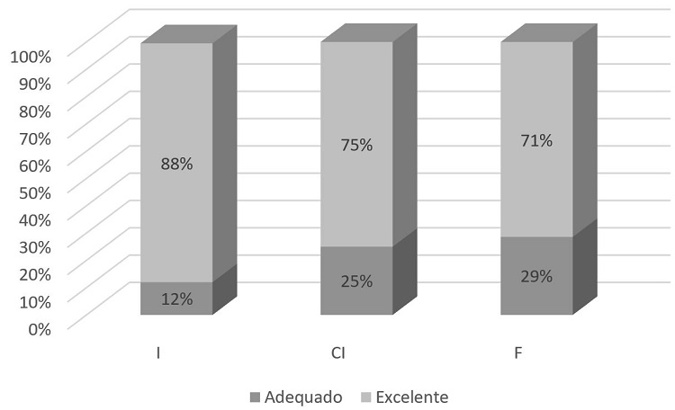 Na análise geral do conteúdo relacionado à DA, foi predominante a excelência do material, em todos os submenus. Ao verificar a classificação dos dados referentes à doença de Alzheimer, de acordo com cada categoria, foi considerado “adequado” por 75% dos idosos, “excelente” por 84% dos cuidadores e 82% dos fonoaudiólogos ( Figura 3 ).