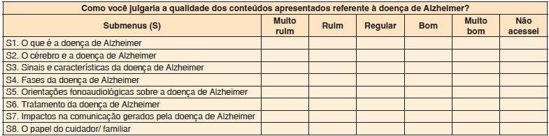 Resultados: A pesquisa contou com a participação de pessoas com diferentes níveis educacionais, que acessavam a Internet com frequência, observando-se prevalência do gênero feminino. A análise do conteúdo apontou diferença estatisticamente significativa no escore geral entre idosos versus cuidadores e fonoaudiólogos, além dos submenus relacionados ao cérebro e à DA, as fases e os impactos na comunicação. O conteúdo do website foi avaliado como “excelente” e qualidade técnica do website apresentou-se como “adequada”.