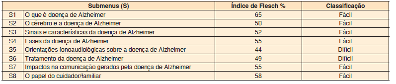 A fim de facilitar a legibilidade e acessibilidade do material, foi utilizado o Índice de Flesch, encontrando-se somente dois textos (de dois submenus) caracterizados como difíceis, sendo eles “Orientações fonoaudiológicas sobre a Doença de Alzheimer” e “Tratamento da Doença de Alzheimer”. O índice acusou dificuldade de legibilidade do primeiro, pois as informações foram disponibilizadas em formato de tópicos, o que influenciou o cálculo baseado em sentenças e palavras. O segundo foi dado como “difícil”, porém seu percentil se aproximou do “fácil”.
