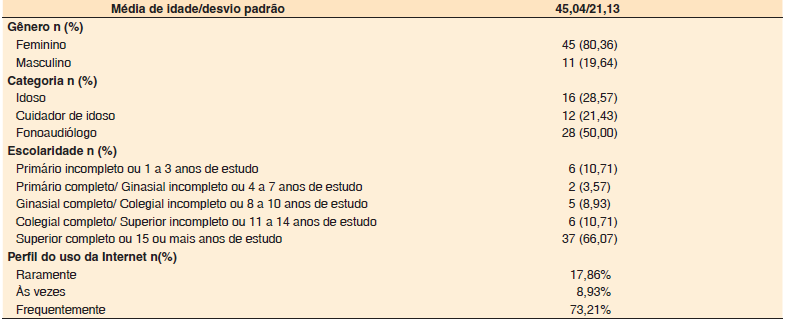 A avaliação do material foi realizada por um total de 56 indivíduos, sendo 16 idosos, 12 cuidadores de idosos e 28 fonoaudiólogos. As variáveis de identificação da amostra estão apresentadas na Tabela 1 .