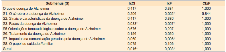 Ao analisar cada submenu, de acordo com as categorias, observou-se diferença estatisticamente significativa nos submenus sobre o cérebro e a DA, as fases, impactos na comunicação e o escore geral entre as categorias ( Tabela 3 ). A comparação do escore geral com a escolaridade não apontou diferença estatisticamente significativa.