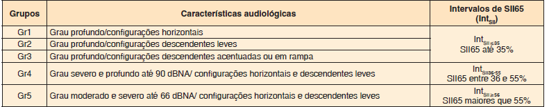 As orelhas foram classificadas conforme grupos e intervalos de SII65(12). Foi proposta uma classificação que considerasse a dinâmica da relação entre grau e configuração da perda auditiva. O Quadro 1 resume o resultado da classificação das perdas auditivas em cinco grupos.
