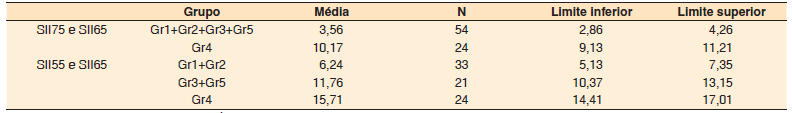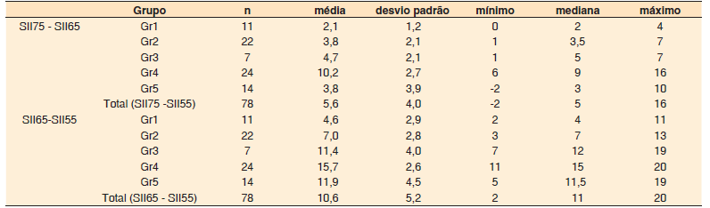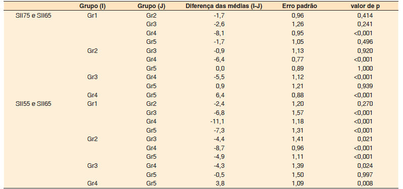 A técnica de análise de variância foi utilizada para comparar as médias das diferenças nos cinco grupos, para as relações SII75 e SII65 e SII55 e SII65. Constatou-se que houve variação entre as médias das diferenças nos cinco grupos (p<0,001). O método de Tukey foi, então, utilizado para localizar as diferenças entre as cinco médias. Os resultados obtidos estão resumidos na Tabela 2 .