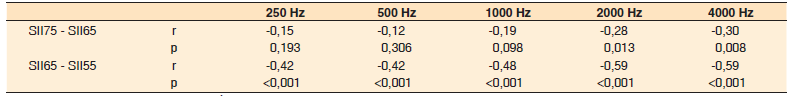 Os valores do coeficiente de correlação de Pearson da diferença SII75 - SII65 e SII65 - SII55 e os limiares auditivos em 250, 500, 1000, 2000 e 4000 Hz estão apresentados na Tabela 4 .