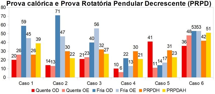 Em todos os casos, observou-se compensação vestibular. Sabe-se que esta é uma sequência de eventos que ocorrem logo após uma lesão no sistema vestibular, e os pacientes do presente estudo, por sua vez, possuíam lesões consideradas crônicas (de 12 meses até 8 anos). Além disso, nos casos 1, 2 e 3, observaram-se valores absolutos na PRPD inferiores aos valores absolutos na prova calórica, bem como no caso 6, porém com valores mais discretos neste ( Figura 2 ). Apesar da divergência na literatura, esse fenômeno, caracterizado como decrutamento, refere-se à inversão do que se espera em indivíduos normais, em que os valores obtidos na PRPD são mais intensos do que os valores obtidos na prova calórica, sendo mais frequente em alterações centrais(15).