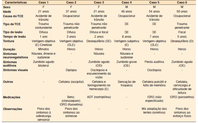 Participaram da pesquisa seis sujeitos (três mulheres e três homens), com idades variando entre 21 e 54 anos, com queixa de tontura de longa duração após TCE por acidentes de trânsito (três) e ocupacionais (três). Observou-se também a presença de outros sintomas decorrentes do TCE, tais como neurovegetativos, visuais, cefaleia, além de medicamentos psicotrópicos ( Tabela 1 ).