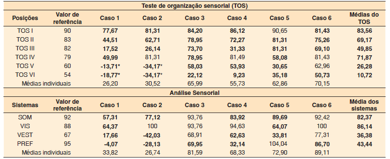 Nos resultados da posturografia, observaram-se piores valores em média nos TOS V e VI e, consequentemente, nos sistemas vestibular e de preferência visual. Nos casos 1 e 2, houve alterações tanto nas provas oculomotoras da VENG quanto na calórica, fato corroborado pela análise sensorial na posturografia, na qual os sistemas com piores valores foram os já citados.