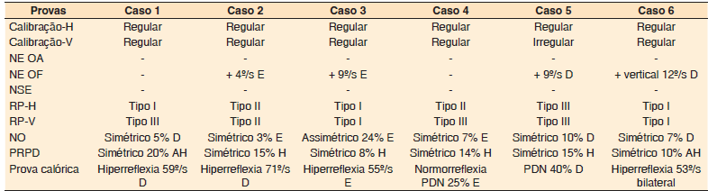 Na prova calórica, o NE de olhos fechados pode ocasionar preponderância direcional para o mesmo lado estimulado e acarretar assimetria direcional superior à marca do padrão de normalidade do nistagmo pós-calórico(6), como pode ser verificado no caso 5, ou somar à VACL nos valores absolutos, interferindo no resultado da prova calórica, como no caso 3. Nos outros casos em que o NE esteve presente, sua direção foi a mesma da hiper-reflexia ou vertical (caso 6), com menos interferência da VACL no resultado pós-calórico.