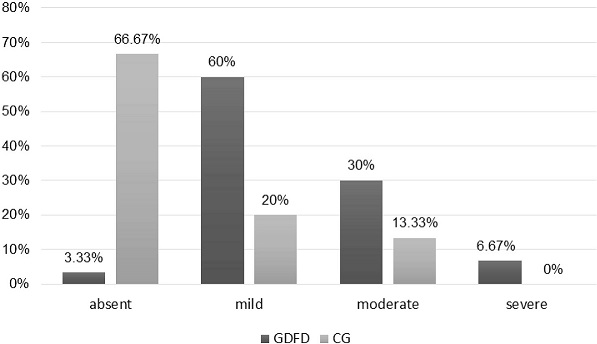 Em relação à presença e gravidade de sintomas de DTM, os resultados obtidos no QA demonstraram predomínio da ausência ou grau leve de sintomas da DTM no GC. Já no GDDF, observou-se presença de grau leve, seguida dos graus moderado e grave (Figura 1).