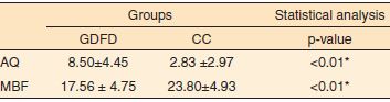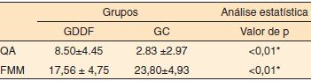 Quanto aos escores do QA e valores da força de mordida máxima (FMM), verificou-se diferença significativa na comparação entre a média dos escores do GDDF e do GC, com maior presença de sinais e sintomas de DTM no grupo com DDF, bem como menores valores estatisticamente significativos de FMM para o GDDF, em relação ao GC (Tabela 1).