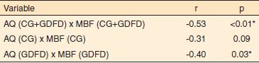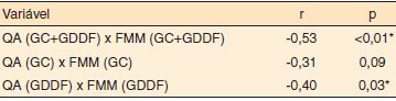 Os resultados da aplicação do teste de correlação de Spearman indicaram que houve correlação negativa e significante entre os escores do QA e os valores da FMM, quando analisados os grupos GDDF e GC juntos, especificamente no grupo GDDF, verificando-se que quanto maior a gravidade dos sintomas da DTM, menor o valor da força de mordida, tanto nos grupos GDDF e GC. Contudo, não houve correlação entre os resultados do QA e a FMM para o grupo GC (Tabela 2).