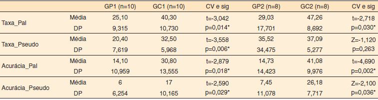 O estudo comparativo dos grupos, quanto à fluência e acurácia na leitura de itens isolados, mostrou valores mais baixos de taxa e acurácia de GP1 e GP2, quando comparados aos seus respectivos grupos controle, com exceção da taxa de pseudopalavras apresentada pelo GP2, semelhante ao seu grupo controle (Tabela 1).