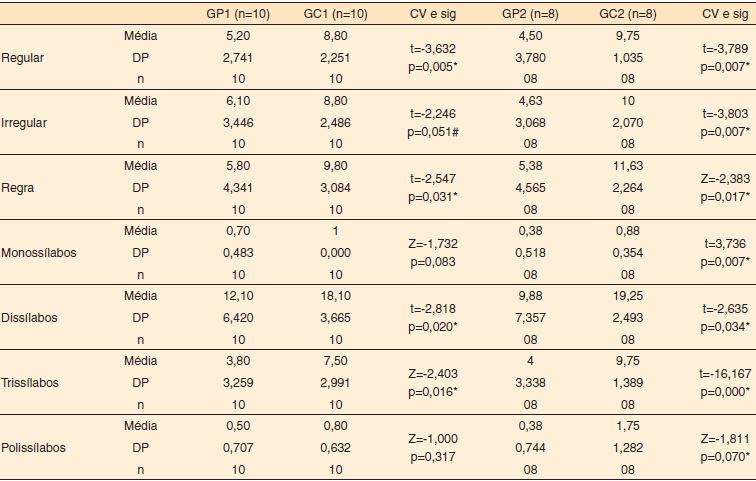 A comparação do desempenho dos grupos pesquisa para a leitura, de acordo com as características de regularidade dos itens psicolinguísticos, foi estatisticamente inferior aos seus respectivos grupos controle, para todas as variáveis de estudo, exceto para palavras irregulares, cuja comparação mostrou apenas tendência para diferenciação entre os grupos GP1 e GC1, p=0,051.