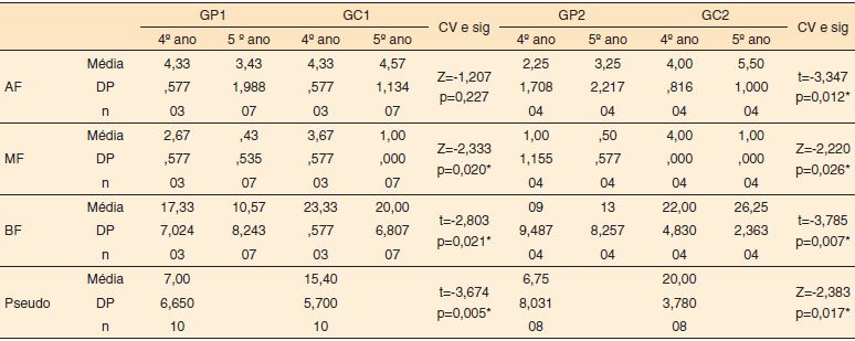Para o estudo estatístico, inicialmente investigou-se a normalidade dos dados, por meio do teste Shapiro-Wilk, em que variáveis com valores de p abaixo de 0,05 foram consideradas não normais. A seguir, a análise inferencial foi realizada por meio do teste T para amostras dependentes (ou emparelhadas), para as variáveis de distribuição normal, e o teste Wilcoxon, para as variáveis de distribuição não normal. Utilizou-se, também, o teste não paramétrico de Mann-Whitney, para a comparação entre os grupos. Para as análises, consideraram-se significativas somente diferenças com valor de p<0,05.