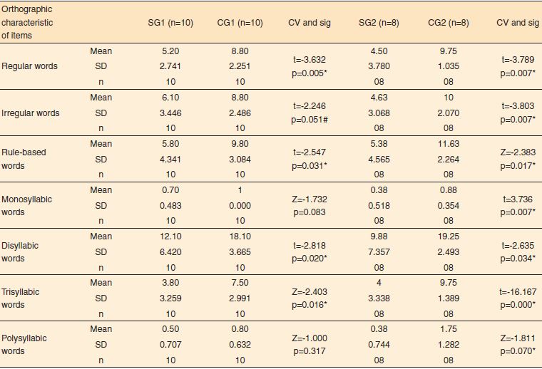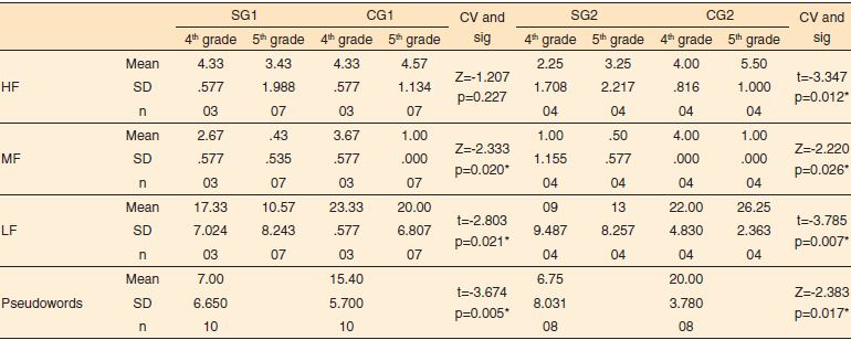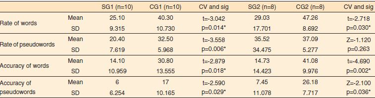 Results: Lower values of rate and accuracy were observed in the study groups compared with those of the control groups, except for the rate of pseudo words in SG2. The study groups showed lower statistical results than the control groups for all regularity variables, except for irregular words. SG1 and CG1 presented similar performance in the reading of monosyllabic and polysyllabic words. Regarding trisyllabic and dissyllable words, significantly lower mean values were found in SG1 compared with those of CG1; however, SG2 showed significantly lower performance regardless of item extension. Performance of the study groups with respect to item familiarity was significantly lower for all variables, except for high frequency.