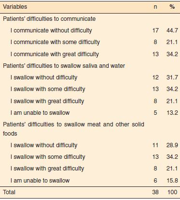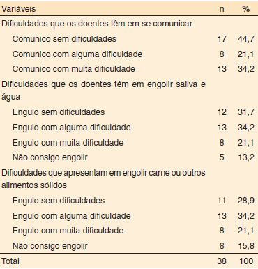 O número total de sujeitos que referiram dificuldades de comunicação foi maior que dos que mencionaram o contrário. Aliás, pode se acrescentar que 34,2% destes doentes afirmaram comunicar-se com muita dificuldade (respostas variando entre “comunico sem dificuldades” – 44,7%; “comunico com alguma dificuldade” – 21,1%; “comunico com muita dificuldade” – 34,2%; “não consigo comunicar” – 0% e “não sei” – 0%). A maioria dos inquiridos referiu que engolia saliva e água com alguma dificuldade. A hipótese de escolha “engulo com alguma dificuldade” também foi selecionada pela maioria dos doentes, quando questionados por dificuldades em engolir carne ou outros alimentos sólidos (Tabela 1).