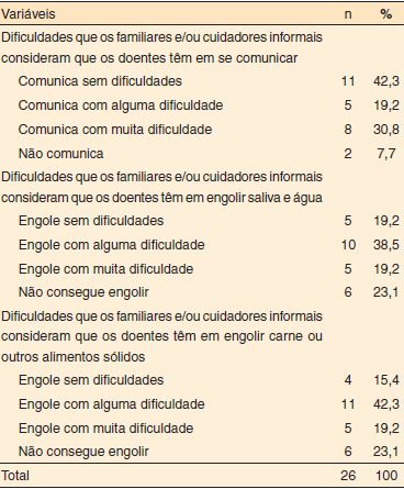 Quando colocadas as mesmas questões aos familiares e/ou cuidadores informais, verificou-se que a maioria considerou que os doentes se comunicavam sem dificuldades. Ainda assim, o total das percentagens indicou que as dificuldades de comunicação foram prevalentes. No que respeita às dificuldades em engolir saliva e água, carne ou outros alimentos sólidos, mencionadas pelos doentes, a maioria considerou que estes apresentavam alguma dificuldade (Tabela 2).