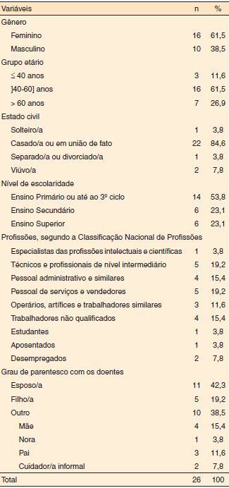 Os dados sociodemográficos dos doentes em cuidados paliativos e de seus familiares e/ou cuidadores informais estão descritos nas Tabelas 3 e 4.