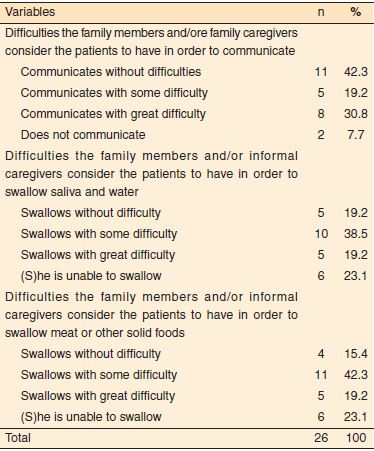 Results: Data indicated that 55.3% of surveyed patients reported that they have difficulty in communicating and 34.2% signaled the “communicate with difficulty” option. In turn, 57.7% of families and/or informal caregivers refer this difficulty as primordial, and the highest percentage (30.8%) was also related to the option “communicate with difficulty”. The percentage of swallowing difficulties presented by the patient and referred to by family members and/or caregivers is high in both groups compared to communication difficulties. 68.5% of the patients surveyed refer difficulties to swallow liquids, while 71.1% mentioned difficulty in swallowing solid food. In the family and/or informal caregivers’ opinion, 80.8% of patients presented difficulty to swallow liquids and 84.6% difficulties in swallowing solids.